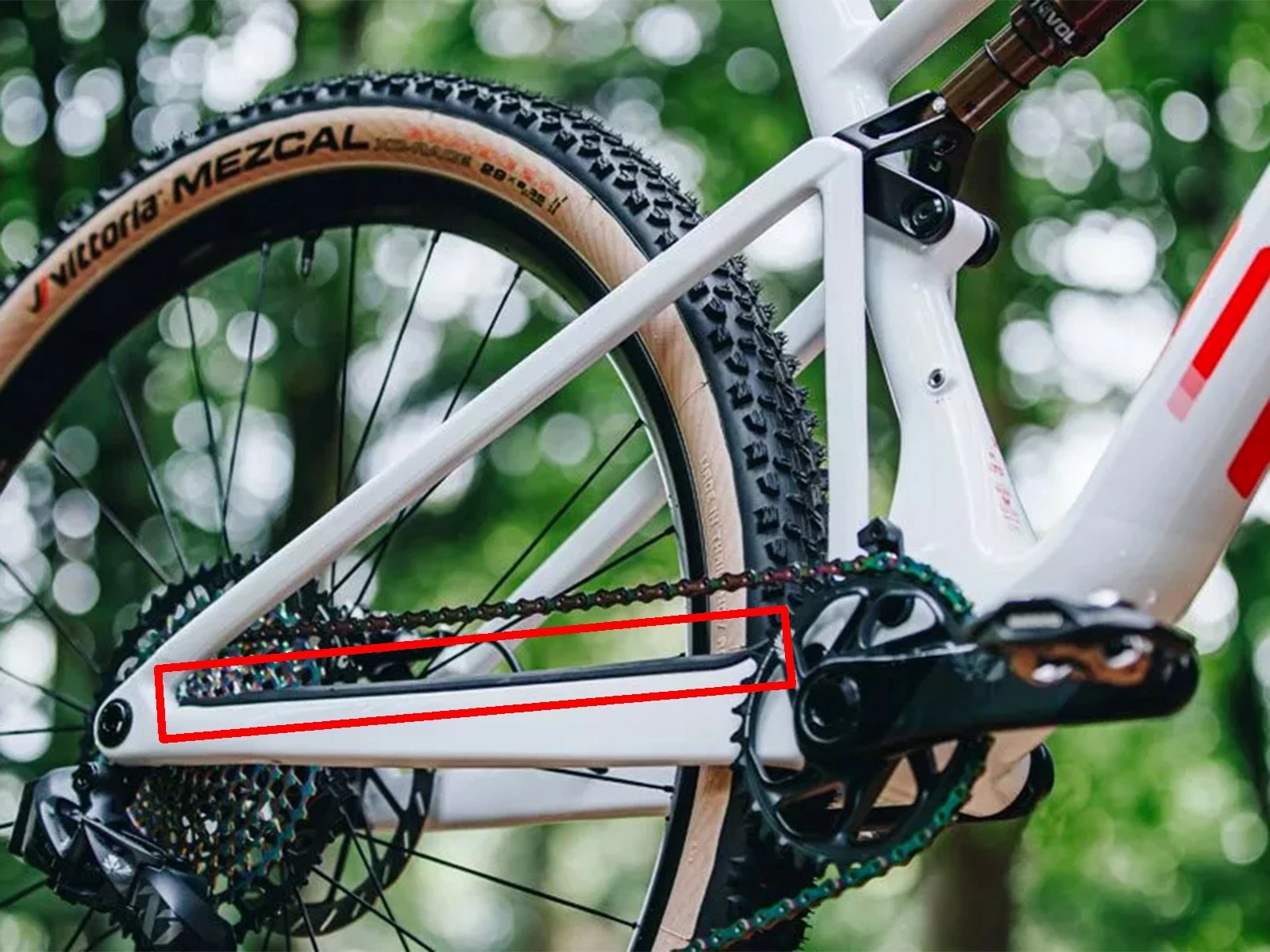 Bande rigide et adhésive permettant de protéger le cadre BMC Fourstroke / FS 01 / FS LT contre les sauts de chaîne.